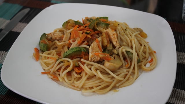 Cozinhe a abobrinha (também al dente e, de preferência, no vapor) e reserve.
