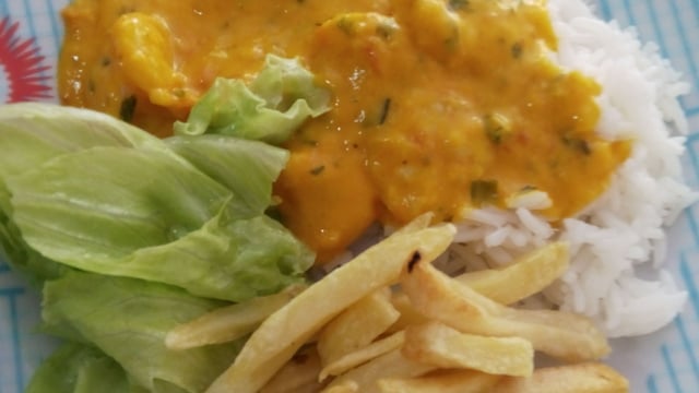 Sirva quente com arroz branco.