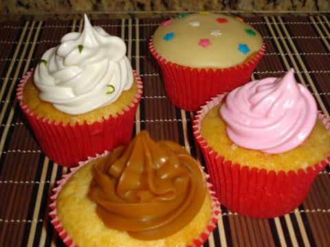 Espalhe sobre os bolinhos e salpique confeitos coloridos.