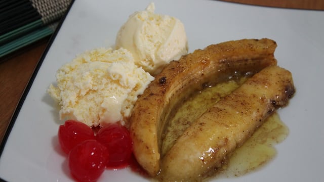 Sirva em um prato o sorvete e despeje por cima a banana flambada.