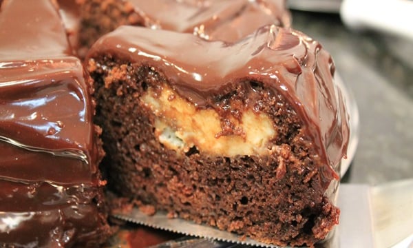 Bater todos os ingredientes do bolo e colocar em uma assadeira grande de preferência redonda, untada e polvilhada e sobre a massa crua, acrescentar as colheradas do creme reservado.