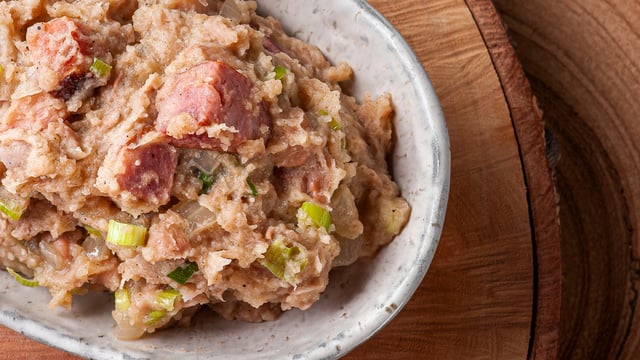 Junte o feijão, os temperos e o cheiro verde e por fim a farinha até dar o ponto desejado, mais cremoso ou mais sequinho.