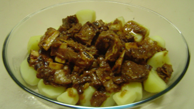 Coloque o restante da costela, cebola, alho, caldo de carne e a pimenta.