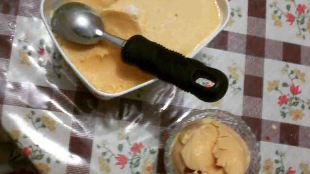E misture mais um pouco e finalmente acrescente a água da calda do pêssego e misture e leve ao congelador.
