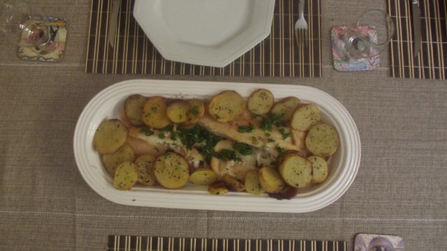Em uma forma coloque uma camada de batatas. Coloque os filés, cubra com uma camada de pimentão, coloque sobre os pimentões uma camada de tomate e cubra com uma camada de cebola e por fim salpique cheiro verde bem picadinho. Cubra com papel alúminio e leve ao forno pré-aquecido até amolecer as batatas e o peixe.