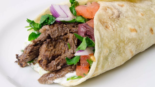 mas pelo que conheço deste prato, a carne devera ser colocada assada no pao sirio