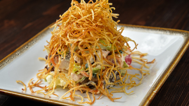 Coloque em um refratário, misture com a cenoura, o milho a ervilha, a batata palha, deixe um pouco da batata para jogar por cima para ficar crocante, e a maionese, misture tudo.