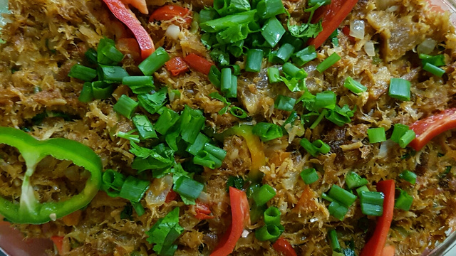 Em uma outra panela, frite o peixe desfiado, depois junte todos os outros ingredientes.