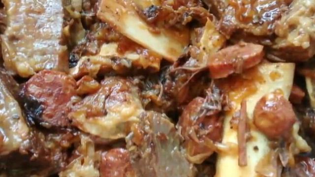 E, em uma panela de pressão coloque um pouco da cebola , cortadas em rodelas largas, a costela, a calabresa, o restante da cebola e as folhas de louro.