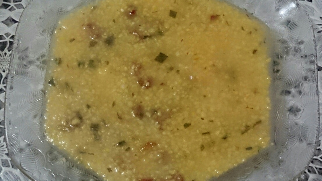 Abra a panela e junte a quirera, cozinhe em fogo brando até a quirera esta cozida e macia.