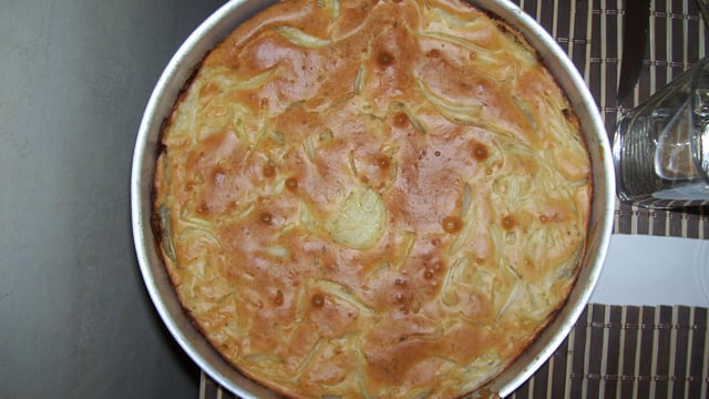 Derrame metade da massa em uma forma untada. Coloque as cebolas e depois a outra metade da massa.