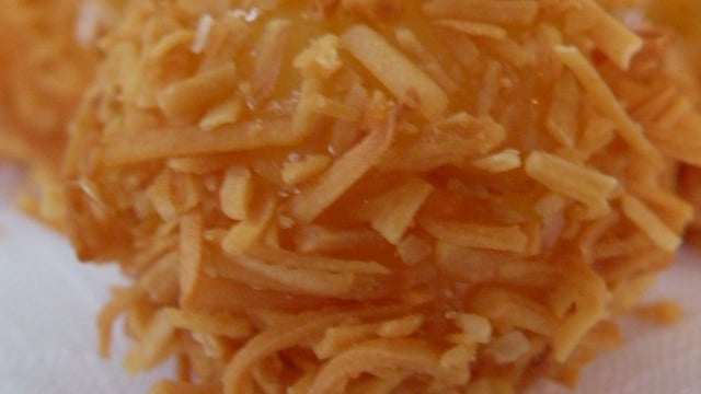 Retirar as bolinhas de coco da geladeira, passar uma a uma na calda e em seguida no coco ralado desidratado e queimado.