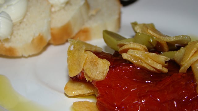 Em uma compoteira ou vidro com tampa coloque em camadas as metades de tomate dobradas ao meio (prove o sal, geralmente não precisa acrescentar mais, depende de seu gosto), regue com o azeite, alho e orégano, e azeitonas verdes fatiadas.