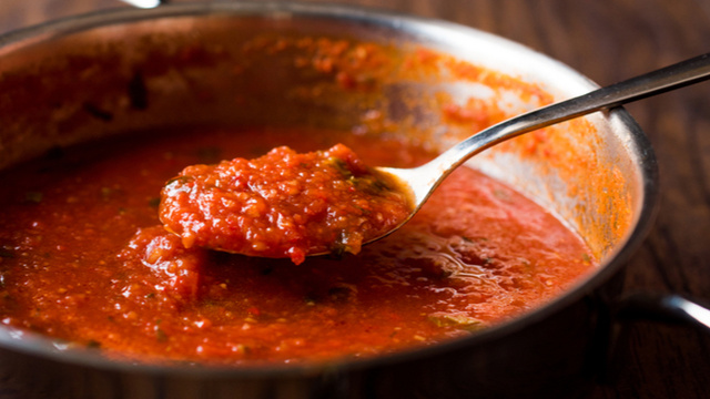 Acrescente ½ lata de extrato de tomate, desligue o fogo e coloque o queijo ralado dentro do molho.