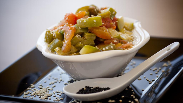 Pique os legumes com casca, tire as sementes dos pimentões, pique tudo como quiser.