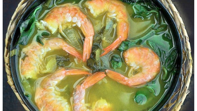 Sirva em uma cuia com uma concha de tucupi, um pouco do mingau, algumas folhas de jambu e os camarões.