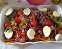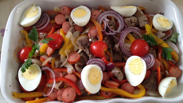 Em um refratário ou bandeja, coloque as batatas fritas e despeje a carne e as verduras em cima. Corte os ovos cozidos em rodelas e coloque sobre a carne. Faça um quadriculado com a maionese e sirva a seguir. Não necessita acompanhamento.