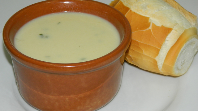 Em uma panela grande derreta a margarina com o azeite. Junte as cebolas fatiadas e deixe amolecer. Passe pelo liquidificador e devolva à panela. Numa panela de pressão cozinhe as batatas com água (cerca de 2 litros) e o caldo de galinha. Bata as batatas no liquidificador com um pouco da água da fervura. Junte à cebola e coloque o restante do caldo. Acerte o sal, deixe apurar. Pouco antes de servir, com a panela desligada junte o creme de leite com soro e mexa bem. Sirva com croutons ou torradinhas, queijo ralado e um fio de azeite.