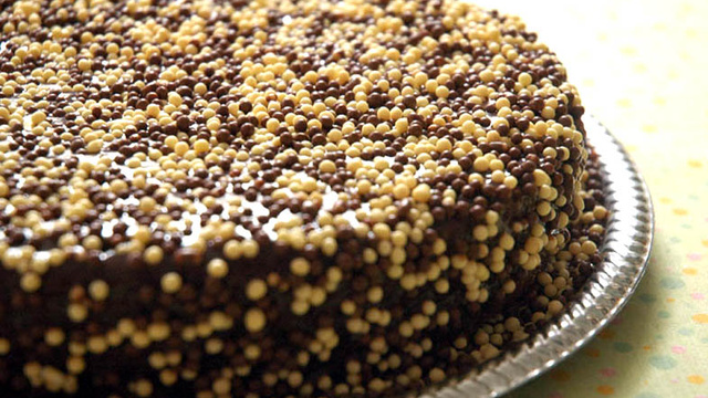 Corte a massa ao meio (na diagonal). Coloque o primeiro disco dentro da mesma assadeira (não precisa lavar), e regue com meio copo de leite. Espalhe todo o recheio. Cubra com o segundo disco, regue com mais meio copo de leite. Vire o bolo em um prato de servir e cubra com a cobertura. Use chocolate granulado ou outro confeito de sua preferência para enfeitar.