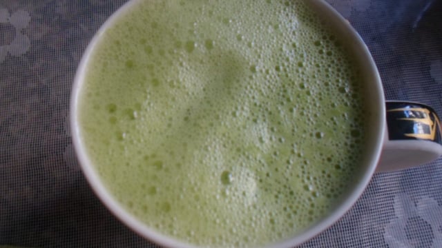 Coloque no liquidificador as laranjas sem as cascas, acrescente a água, as folhas de couve cortadas em pedaços grandes, o açúcar a gosto e bata tudo.