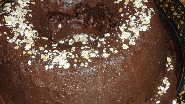 Misture o açúcar, aveia, farinha de trigo, chocolate, noz-moscada e canela.