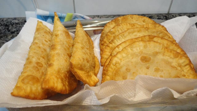 Em seguida, escorra os pasteis em um prato forrado com papel-toalha.