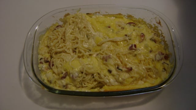 Reserve. Coloque o macarrão em uma travessa refratária, acrescente o creme de manteiga e a mistura de bacon e misture bem.