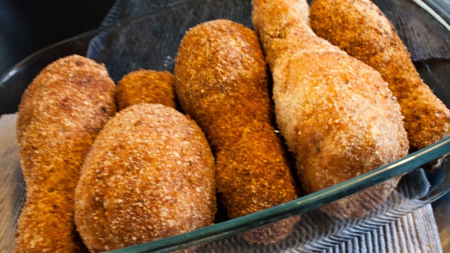 Passe pela clara, pela farinha de rosca, aperte bem e frite em óleo quente sob imersão. Escorra, coloque em papel absorvente e sirva ainda quente.