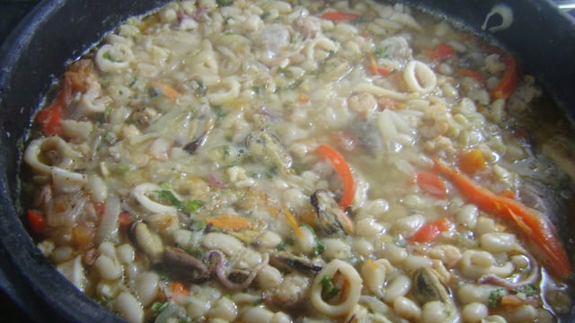 Escolha, lave o feijão e deixe-o de molho de um dia para outro. Tempere o peixe com suco de limão, sal e pimenta. Cozinhe o feijão até ficar bem macio. Enquanto isso, prepare os mariscos e os mexilhões: lave-os bem, em abundante água e coloque-os em uma panela sem acrescentar água e deixe no fogo por 20 minutos.