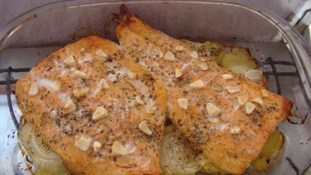 O tempo das batatas cozinharem é o tempo que indica que o salmão já está pronto.