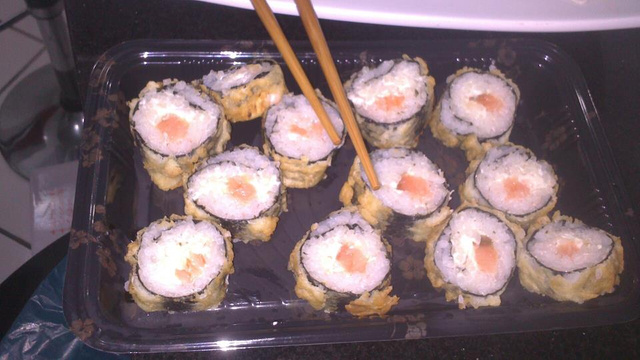 Faça uma linha na horizontal com o salmão, sobre o arroz.