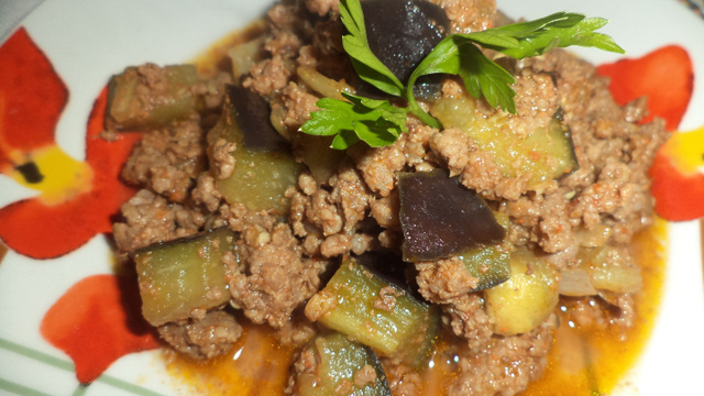 Escorra a beringela e misture com a carne.