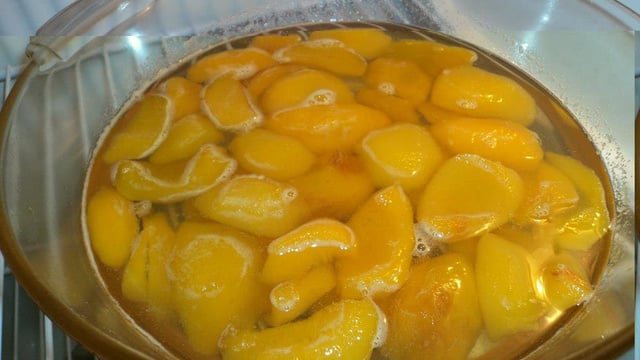 Descasque os pêssegos e coloque na panela de pressão, coloque o açúcar, a água e a pitada de sal.