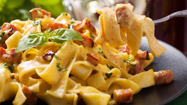 Unte um refratário com margarina e intercale 2 ou 3 camadas de macarrão, presunto e queijo.