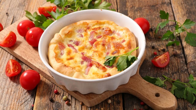 No liquidificador, bata o leite, o óleo, os ovos, o queijo parmesão, o cheiro verde picado, o caldo de galinha e o sal, acrescente aos poucos a farinha de trigo e por último o fermento em pó. Unte um recipiente com margarina e despeje a metade da massa.