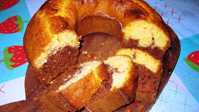 Em seguida, coloque metade da massa em uma forma untada e enfarinhada, e a outra metade coloque o chocolate em pó e misture, por cima da massa branca despeje o restante de massa com chocolate.