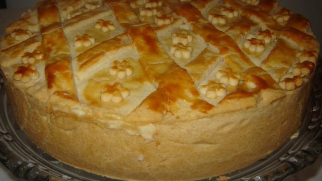 Cubra com o restante da massa, pincele a gema e asse no forno a 220° até dourar uns 40 minutos.