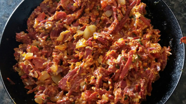 Escalde a carne seca pelo menos 3 vezes para dessalgar.