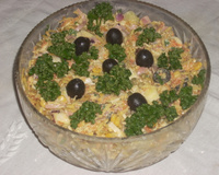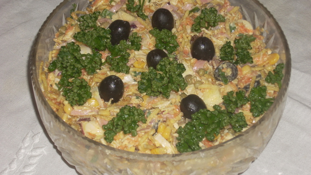 Misture em um recipiente grande: milho verde, palmito, cebola, azeitona, salsa e cebolinha, maçã, cenoura, presunto, frango e a maionese.
