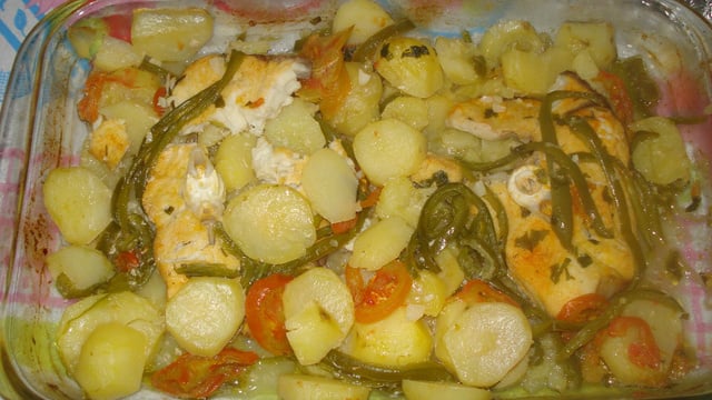 Tempere com sal, pimenta e coloque o peixe e o restante da cebola e das batatas por cima. Espalhe o alho e a pimenta vermelha.