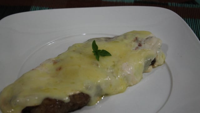 Cubra os filés com a mistura, polvilhe mussarela ralada e leve ao forno para gratinar.