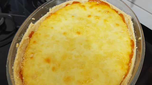 Põe o recheio sobre a massa pré-assada, pulverize o queijo ralado e leve ao forno até gratinar, por 20 minutos.