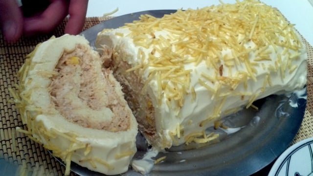 Assim que desenformada colocar o recheio (que pode ser a gosto, como por exemplo de mussarela com presunto, frango desfiado e já preparado para o recheio, etc). Depois de colocado os ingredientes enrole junto com o pano de prato em forma de rocambole.