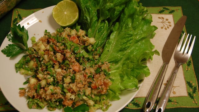 Deixe o trigo de molho por 1 hora. Depois escorra toda água e coloque em uma tigela. Junte os tomates, o pepino, a cebolinha, a salsinha, a manga, a hortelã. Tempere com azeite, sal, limão e pimenta. Misture bem e sirva sobre alface. Uma refeição leve e saudável.