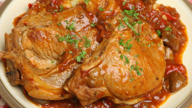 Coloque uma parte do carré dentro da panela, cubra com a cebola que sobrou, uma parte do caldo que adicionou o extrato.