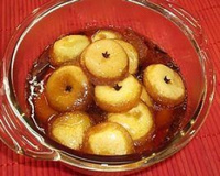 Desenforme a massa assada e perfure por baixo com um palito, acomode a parte furadinha virada para a calda que ainda está em fogo bem baixo, coloque um papinho ao lado do outro na panela, vire-os uma vez.