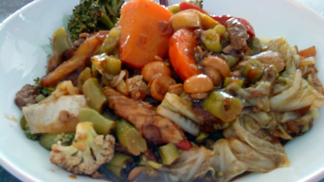 Misture, tampe a panela e quando estiver macio apague o fogo e misture os legumes reservados.
