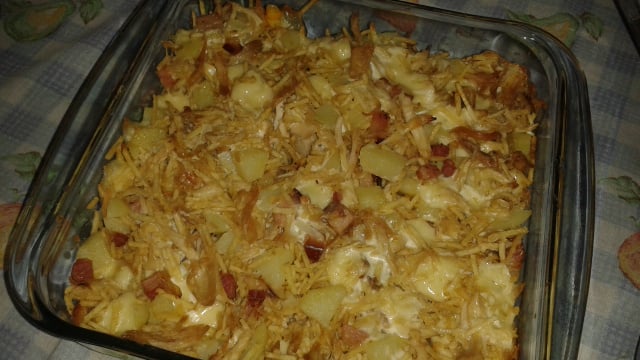 Em um refratário, alterne camadas da mistura e do requeijão, finalizando com este último.