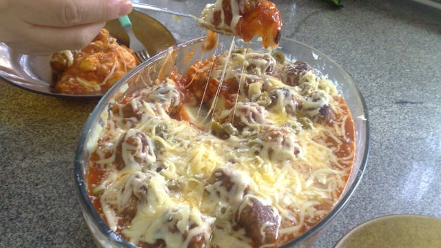 Por cima as almôndegas com o molhos e por último o queijo e o orégano.