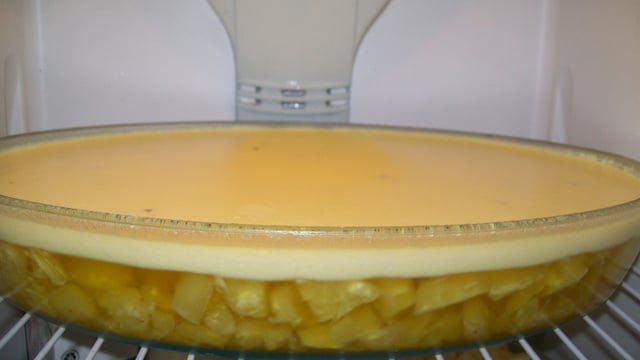 Bata até obter um creme e jogue por cima da camada de abacaxi que está endurecido.